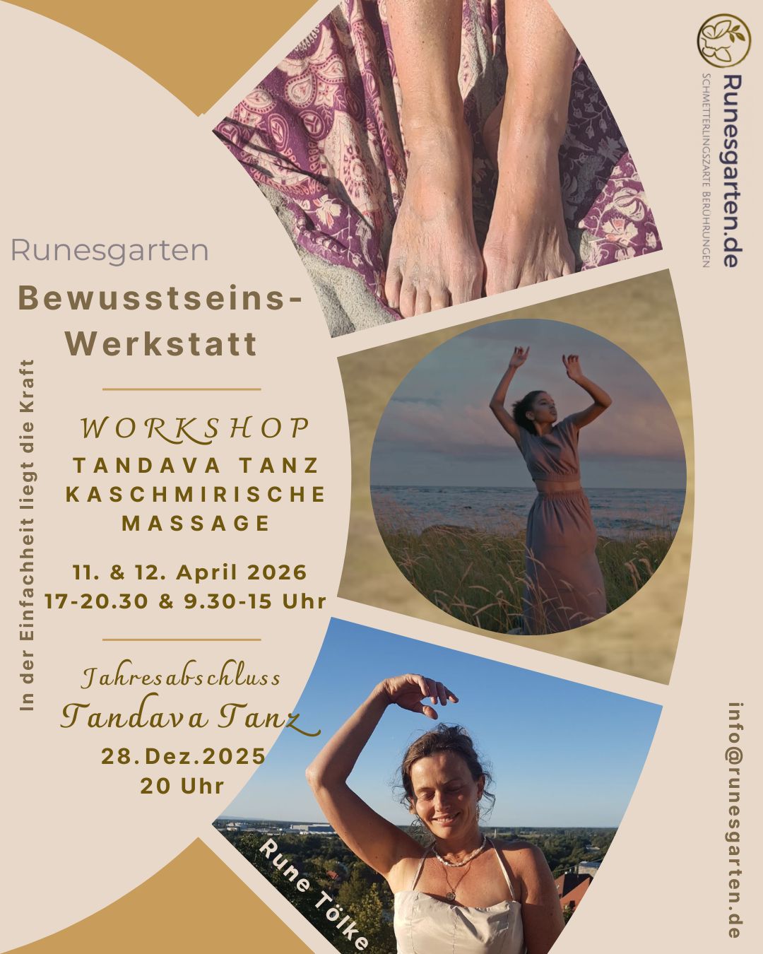 Die Kaschmirische Massage lädt dich ein, mit liebevoller Präsenz in Kontakt zu gehen – absichtslos, lauschend, weich. Im Tandava, dem uralten tantrischen Bewegungstanz, erforschst du dich selbst im Fluss deiner natürlichen Bewegung – atmend, spürend, verbunden.